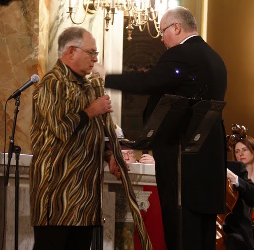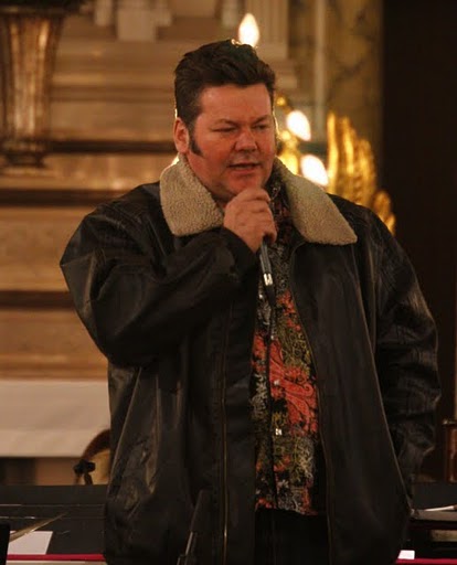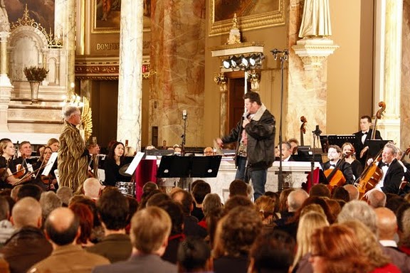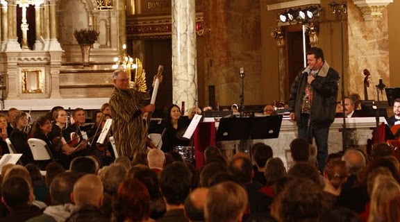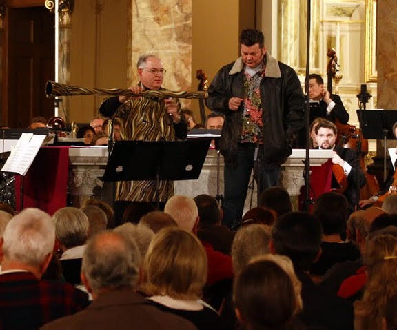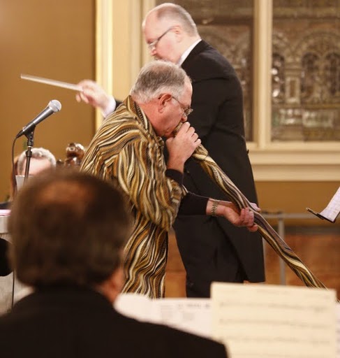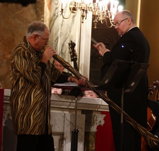 Hal Kacanek playing the didgeridoo, Jamin Hoffman directing the orchestra